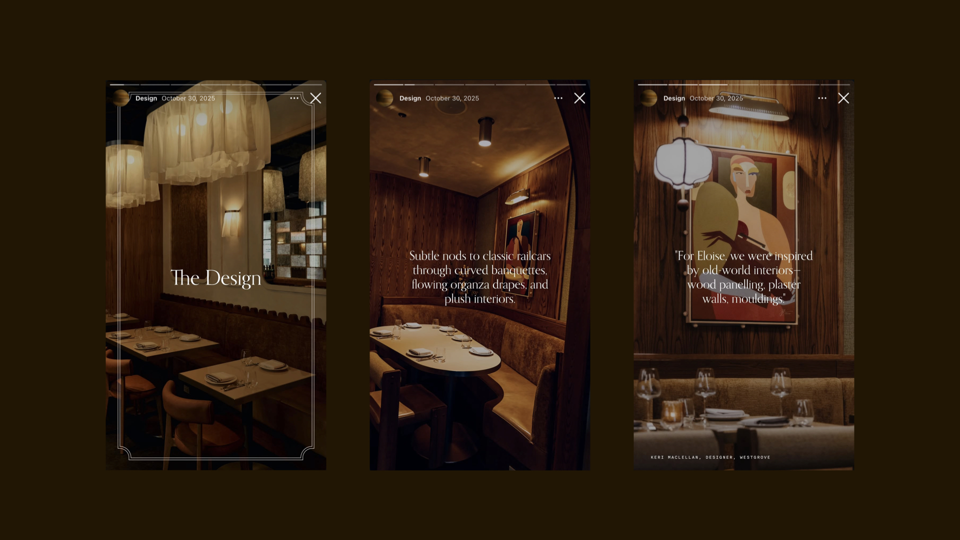Taking cues from the area’s history as a 19th century rail hub, Eloise is inspired by a golden age of train travel and hospitality.Eloise is the 'dining car' of a patron's journey through the evening, leading eventually to Bar Cart, the ‘bar car’ and speakeasy cocktail bar hidden just beside.