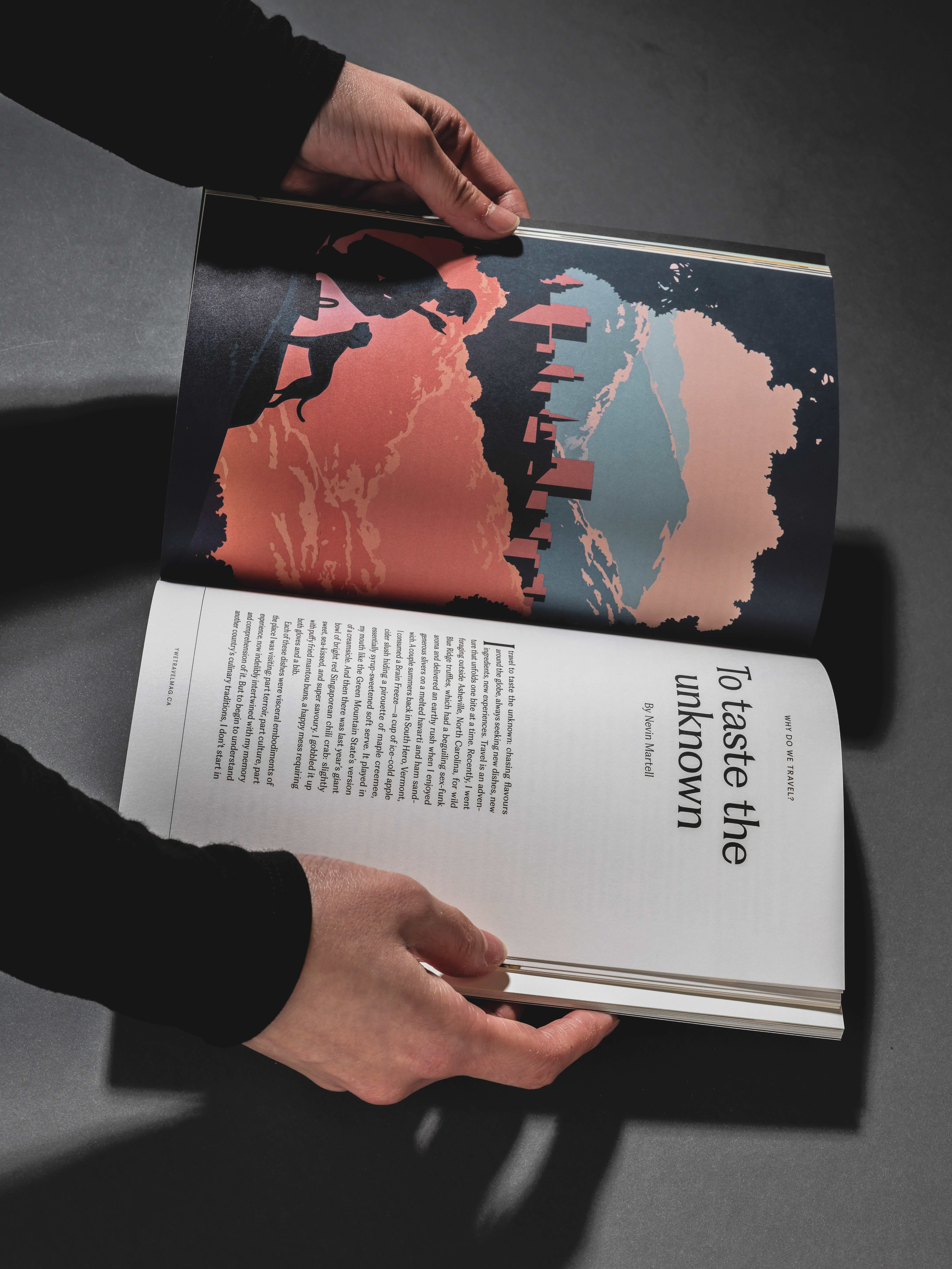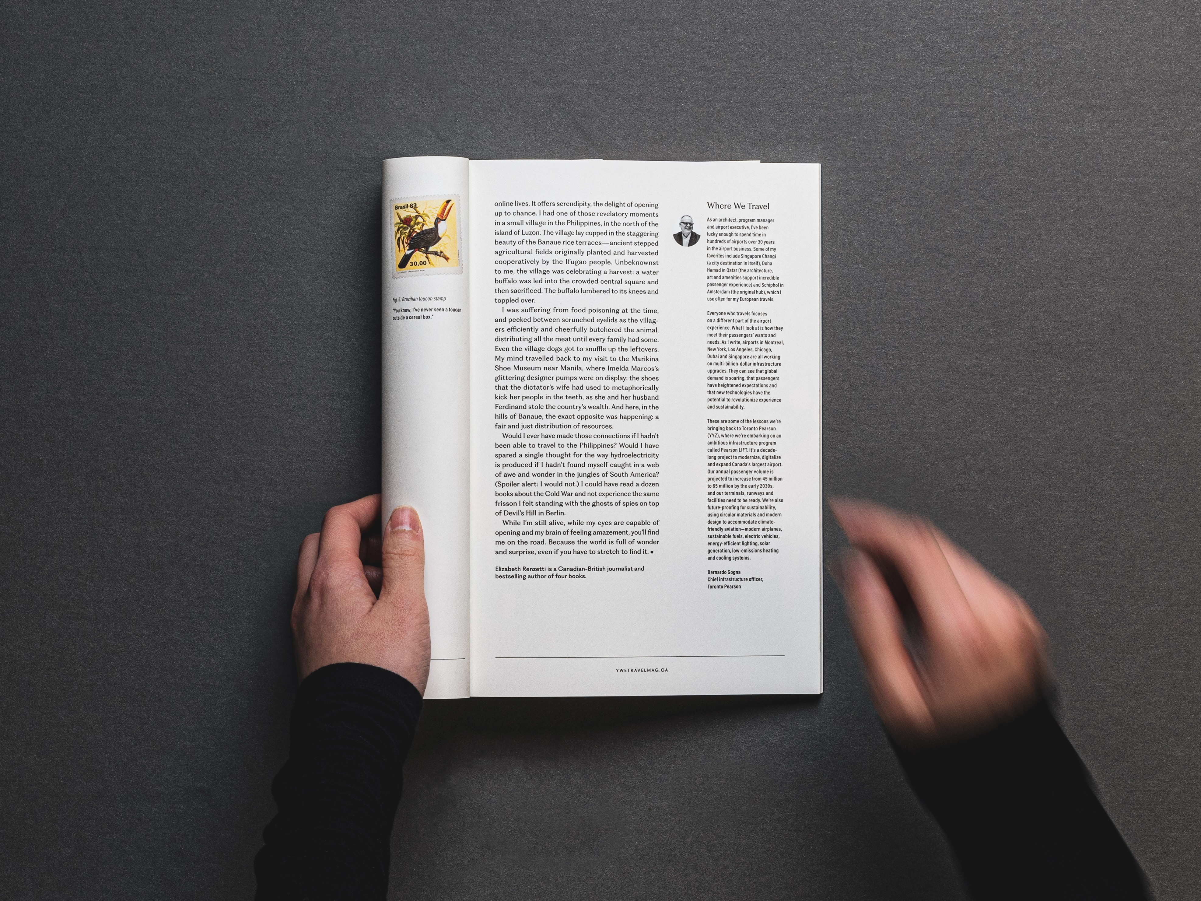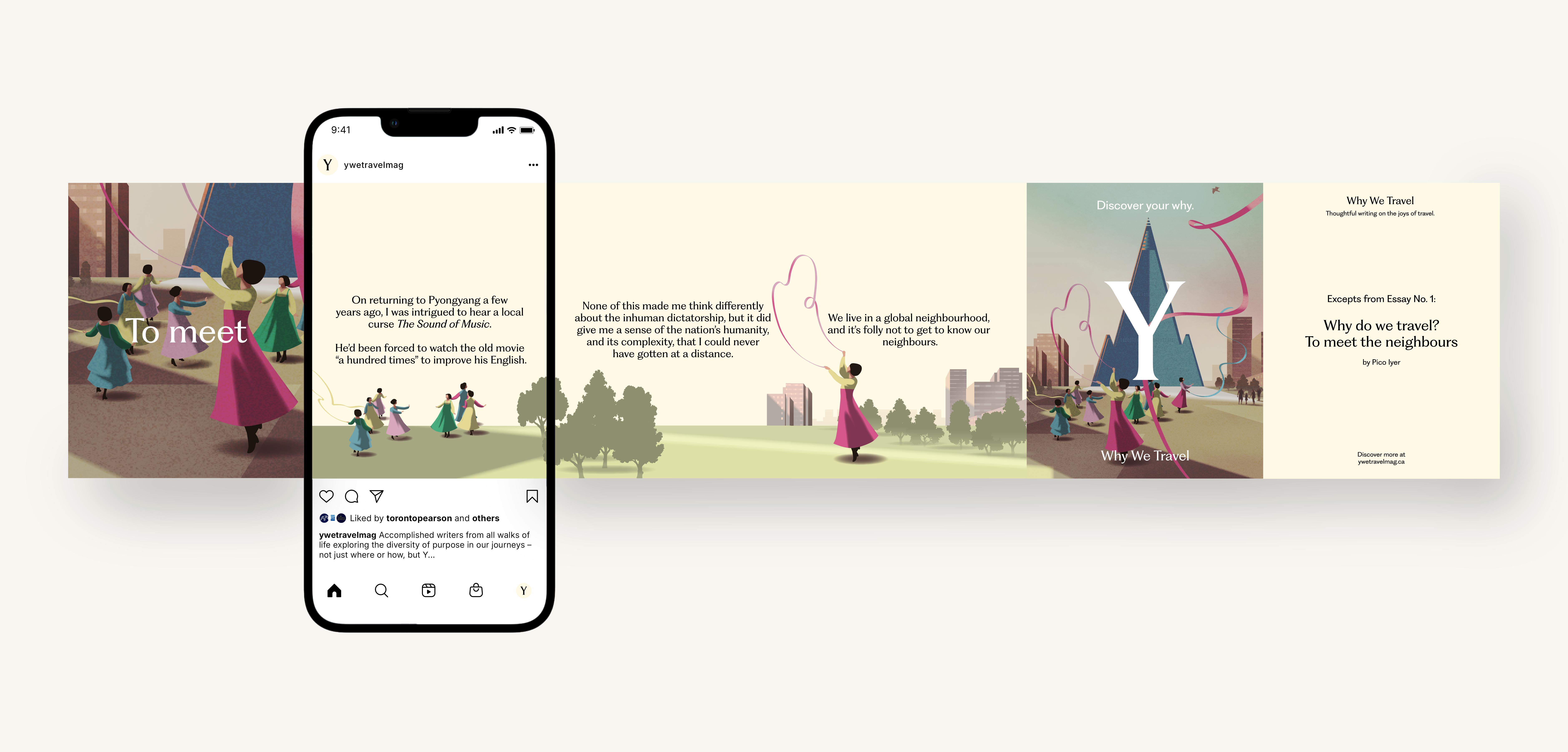 Toronto Pearson Airport, Canada’s largest international airport, is strategically focused on the joy of travel. “Why (Y) We Travel” is an effort to celebrate all the growth, memory, thrill, and discovery travel has to offer with passengers as they navigate from one destination to another as well as a growing airport. Through the course of twelve essays published in partnership with The Walrus and the Canadian Airports council, travel is explored through romantic and sentimental perspectives. To mirror those same perspectives visually we looked to travel and airline posters from the 30-60’s and created our own series of illustrations with Danish illustrator Mads Berg.